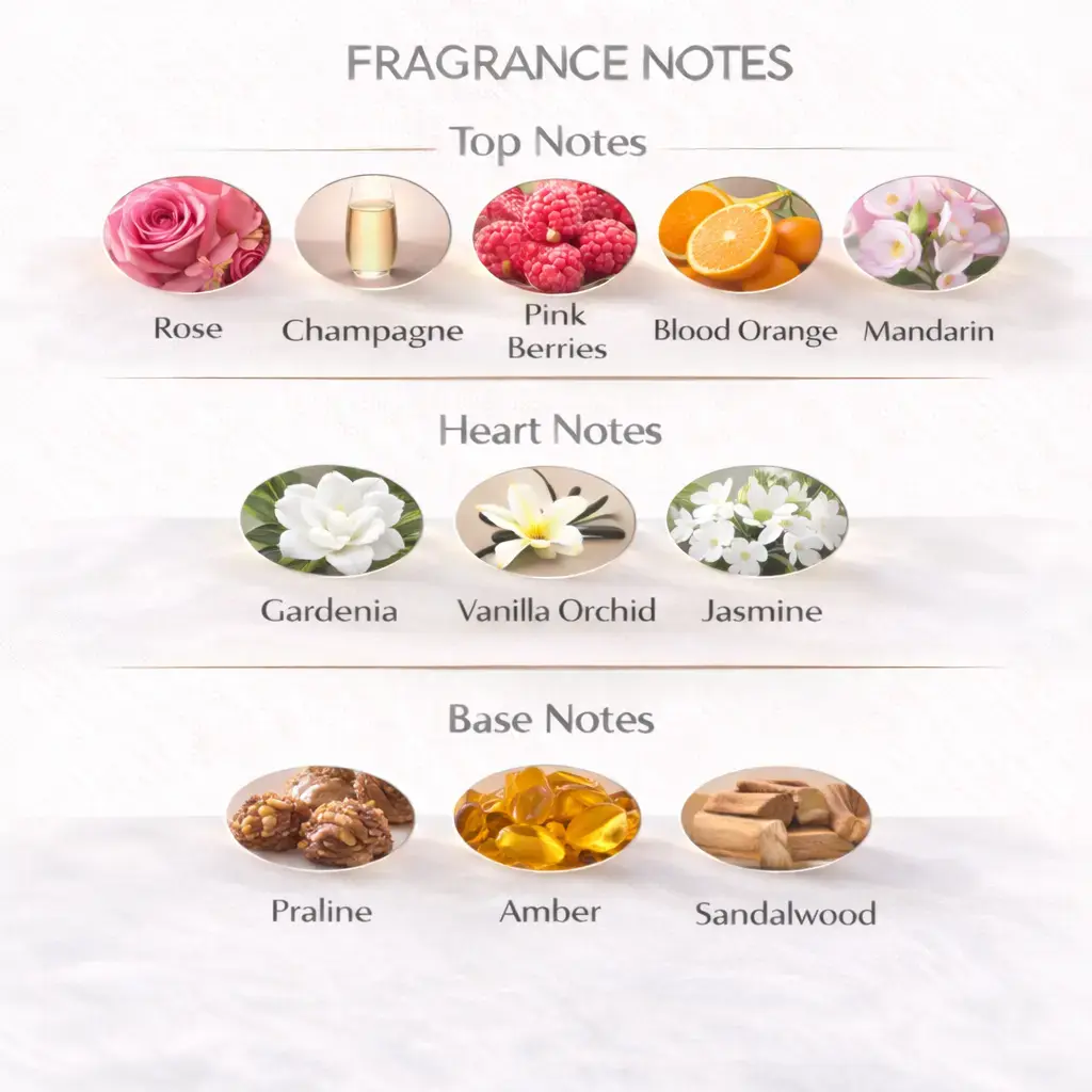 Tas ir dinamisks aromāts, radīts sievietēm Kompozīcija sākas ar mirdzošu šampanieša, zemeņu, mandarīna, sarkanā apelsīna un rozes apvienojumu, radot svaigu augļaini ziedu ievadu Sirds atklājas ar maigu gardēnijas, jasmīna un vaniļas orhidejas buķeti, piešķirot aromātam eleganci un dziļumu Kompozīciju noslēdz silta un jutekliska bāze no dzintara, sandalkoka un pralīnes, radot maigu un pievilcīgu noskaņu