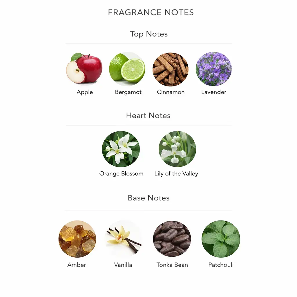 Augšējās notis: ābols, bergamote, kanēlis, lavanda