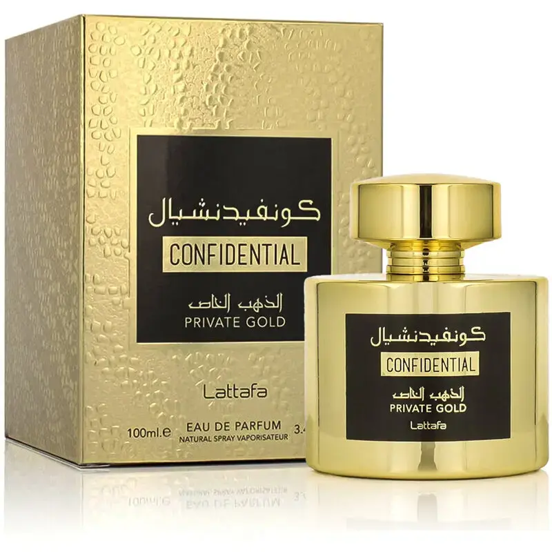 Lattafa Confidential Private Gold ir austrumnieciskas noskaņas unisex aromāts ar siltu, pikantu un maigi saldenu raksturu. Aromāts sākas ar citrusaugļu un garšvielu svaigumu, atveras ziedu un koksnes notīs, bet noslēdzas ar dziļu vaniļas, ambres un muskusa bāzi. Noturīgs, elegants un piemērots gan sievietēm, gan vīriešiem.