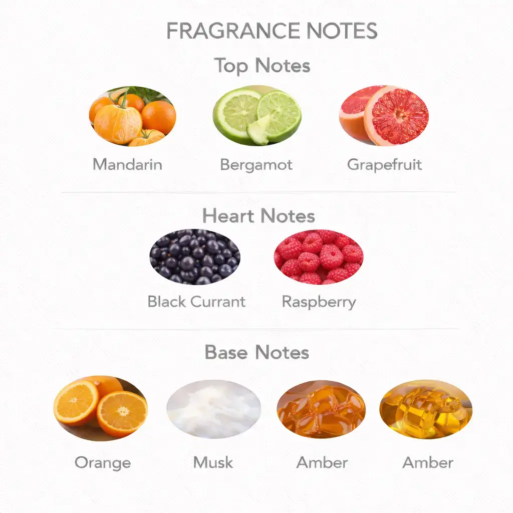 • Augšējās notis: Mandarīns, bergamote, greipfrūts