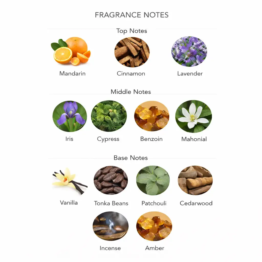 Augšējās notis (Sākuma notis): ābols, bergamote, citrons, kanēlis.
