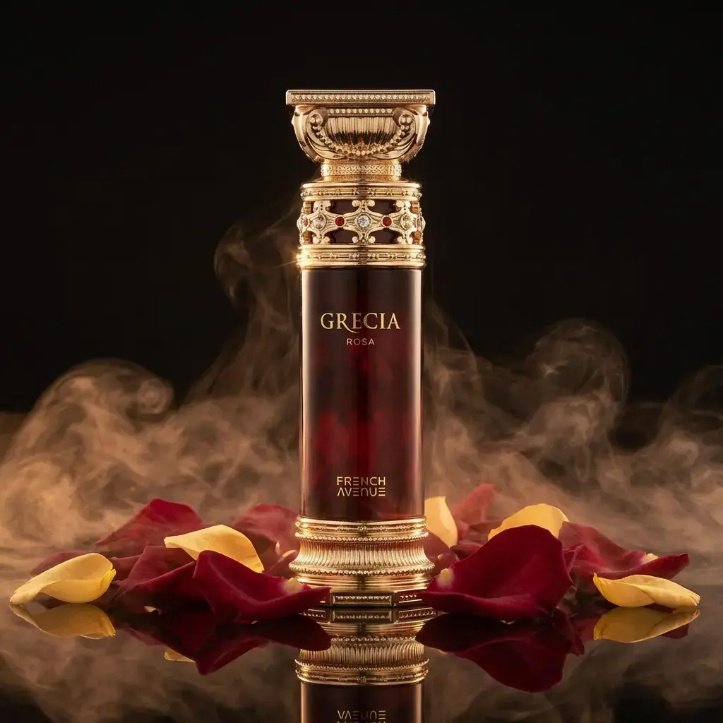 Grecia Rosa Extrait de Parfum — augļu un ziedu uniseksa aromāts ar austrumnieciski koksnainu dziļumu. Dzirkstošas greipfrūta, dzirkstoša šampanieša un sulīga bumbiera notis atklāsmē pakāpeniski pāriet izsmalcinātā peonijas, rozes un jasmīna ziedu buķetē, ko papildina dūmakains olibāna (vīraka) akcents. Aromāta pamatā atklājas siltas ciedra, zemes vetivera un cēlā ouda notis, veidojot bagātīgu un neaizmirstamu aromāta šleifi.