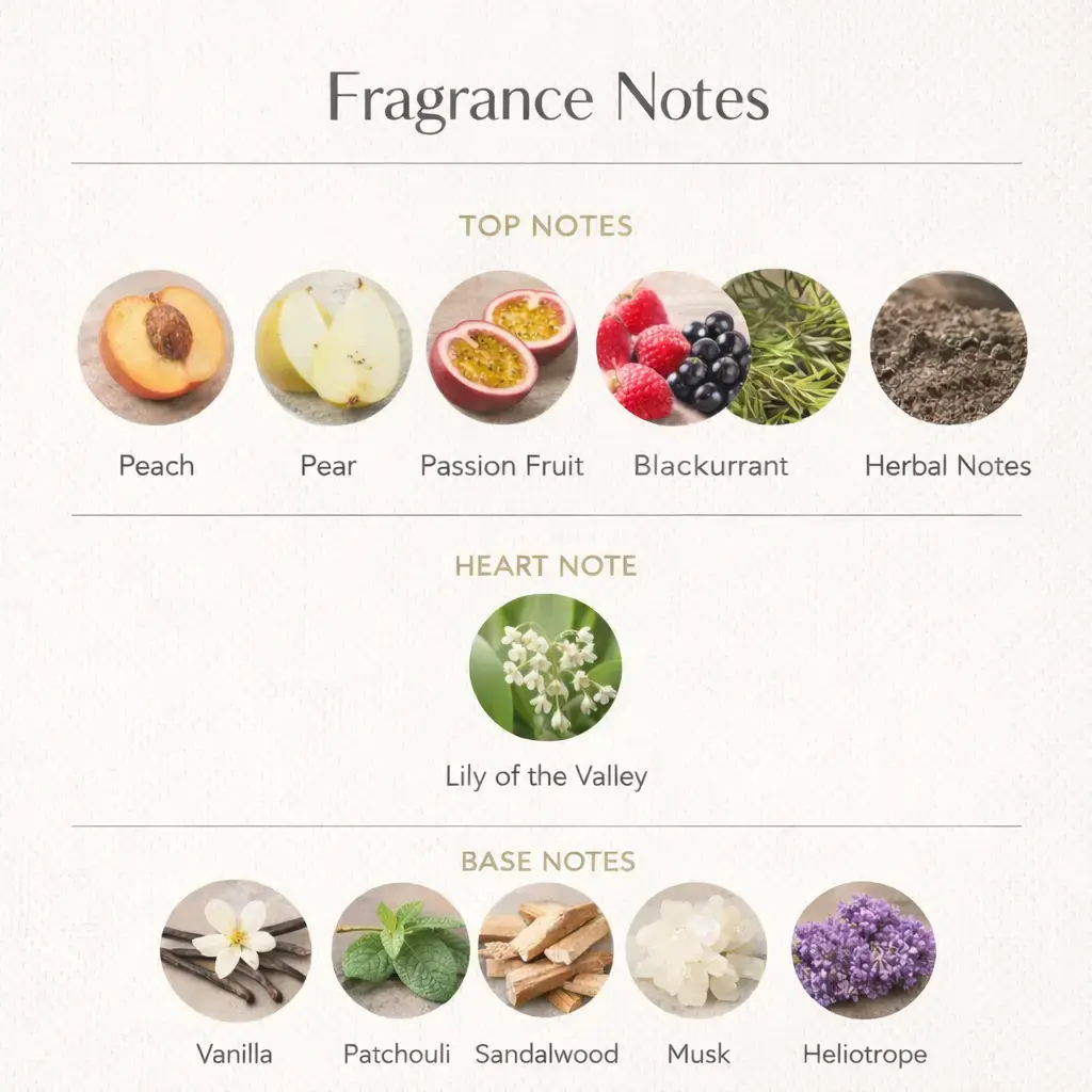 Aromāta sirdī parādās maiga maijpuķītes nots, kas piešķir gaisīgu ziedainumu un līdzsvaro bagātīgo augļu saldumu. Pamatā aromāts balstās uz vaniļu, sandalkoku, pačūliju, muskusu un heliotropu, veidojot siltu, krēmīgu, nedaudz pūderainu un īpaši noturīgu aromāta šleifi ar maigu gardēdisku dziļumu.