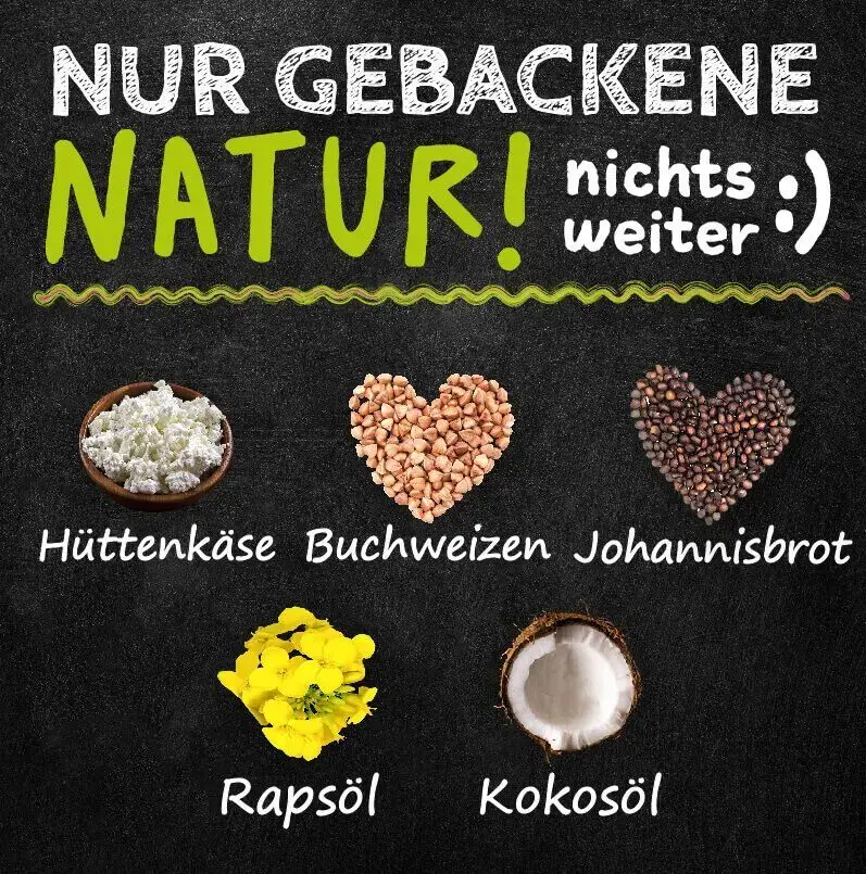Piena produkti (25% biezpiena peptidi), griķi (bez graudiem), ceratonijas koks, glicerīns no kokosriekstu eļļas, rapšu eļļa, kokosriekstu eļļa.