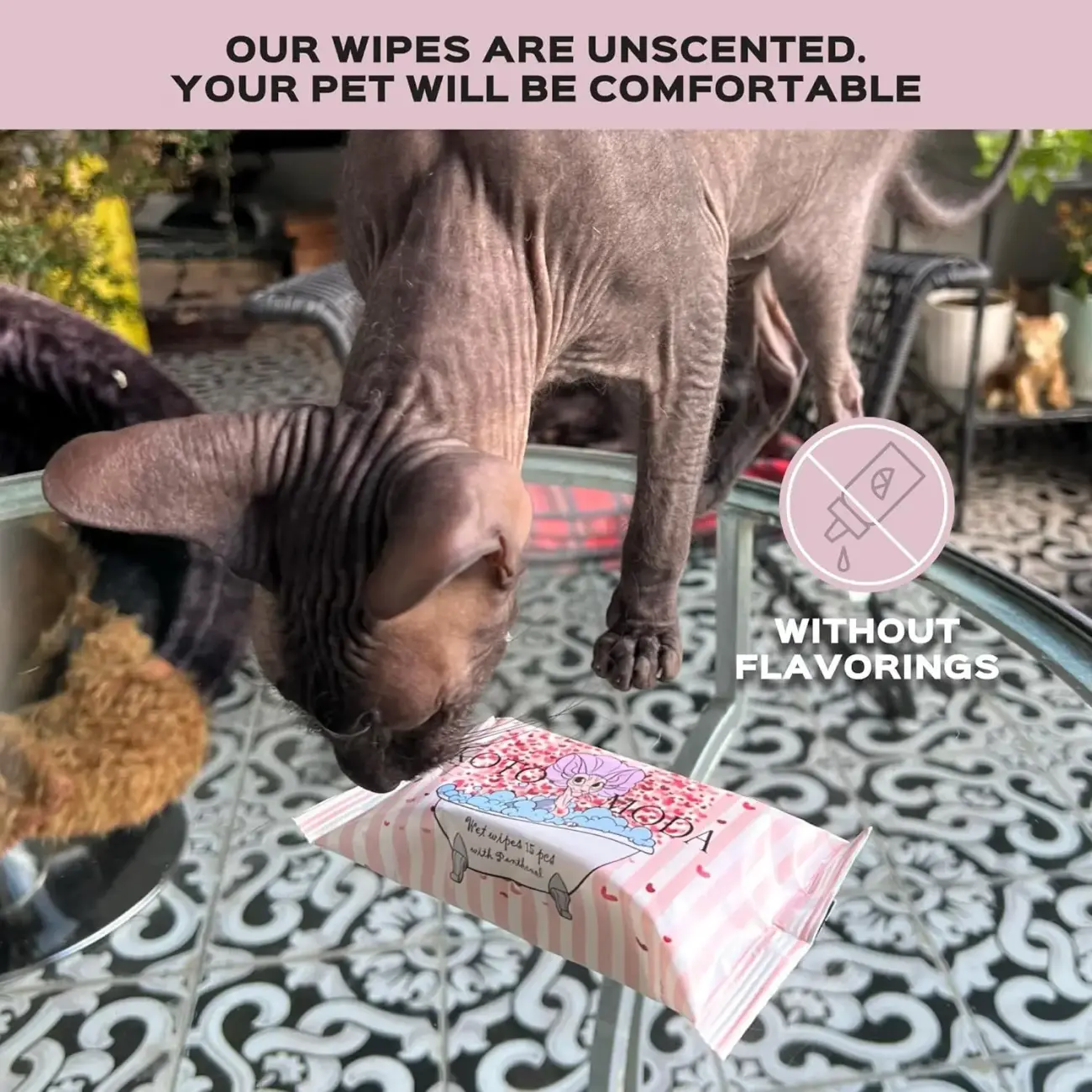Ikdienā lietojot KOTOMODA mitrās salvetes, no Sfinksu kaķa ādas viegli var noņemt netīrumus, sekrēciju un putekļus.