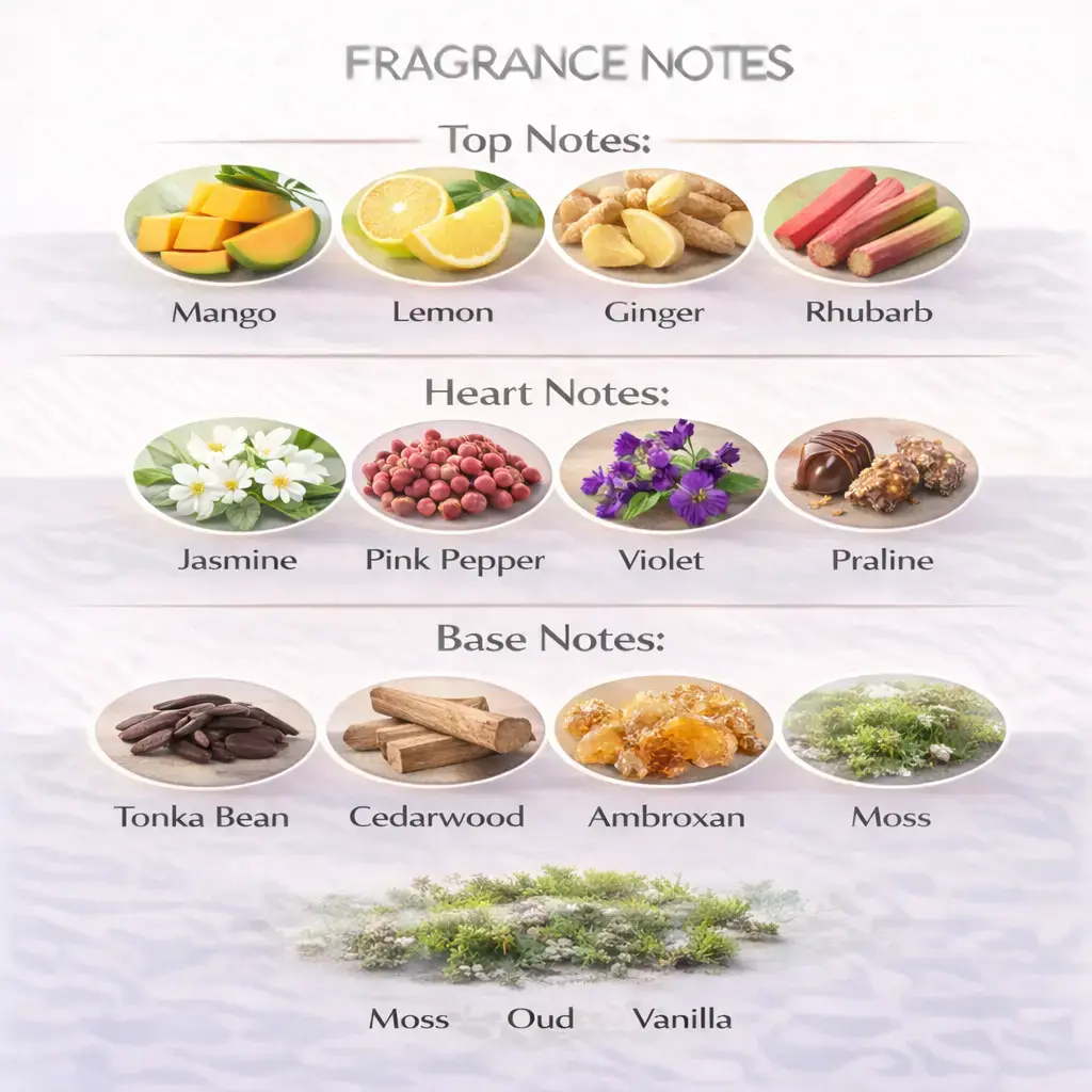 Vulcan Feu от French Avenue раскрывается как взрывная и выразительная ароматическая симфония Яркие верхние ноты сочного манго, освежающего лимона, пряного имбиря и зелёного ревеня наполняют композицию тропической энергией и динамикой Сердце аромата элегантно развивается в утончённый букет, где сияющий жасмин, пикантный розовый перец, пудровая фиалка и сладкий пралин создают соблазнительный контраст мягкости и насыщенности Базовые ноты кремовых бобов тонка, тёплого кедра, обволакивающего амброксана и растительного мха придают глубину, стойкость и оставляют изысканный шлейф на коже