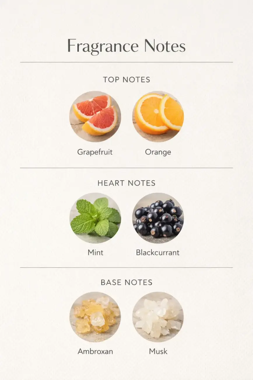По мере развития композиции проявляются освежающая мята и кисло-сладкая чёрная смородина, придающие аромату зелёную прохладу и лёгкий фруктовый объём. В базе доминируют амброксан и мускус, формируя современную, мягко тёплую, слегка древесно-минеральную основу. Этот шлейф сидит близко к коже и создаёт ощущение ухоженности и свежести, ассоциируясь с ароматом чистой рубашки.