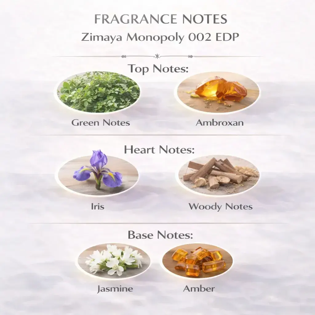 Zimaya Monopoly 002 EDP is a fresh, minimalist unisex fragrance in a “clean skin” style, featuring a green opening, an airy woody heart, and a soft warm trail. It smells very clean and modern, making it ideal for everyday wear, the office, and situations where a subtle yet long-lasting scent is needed